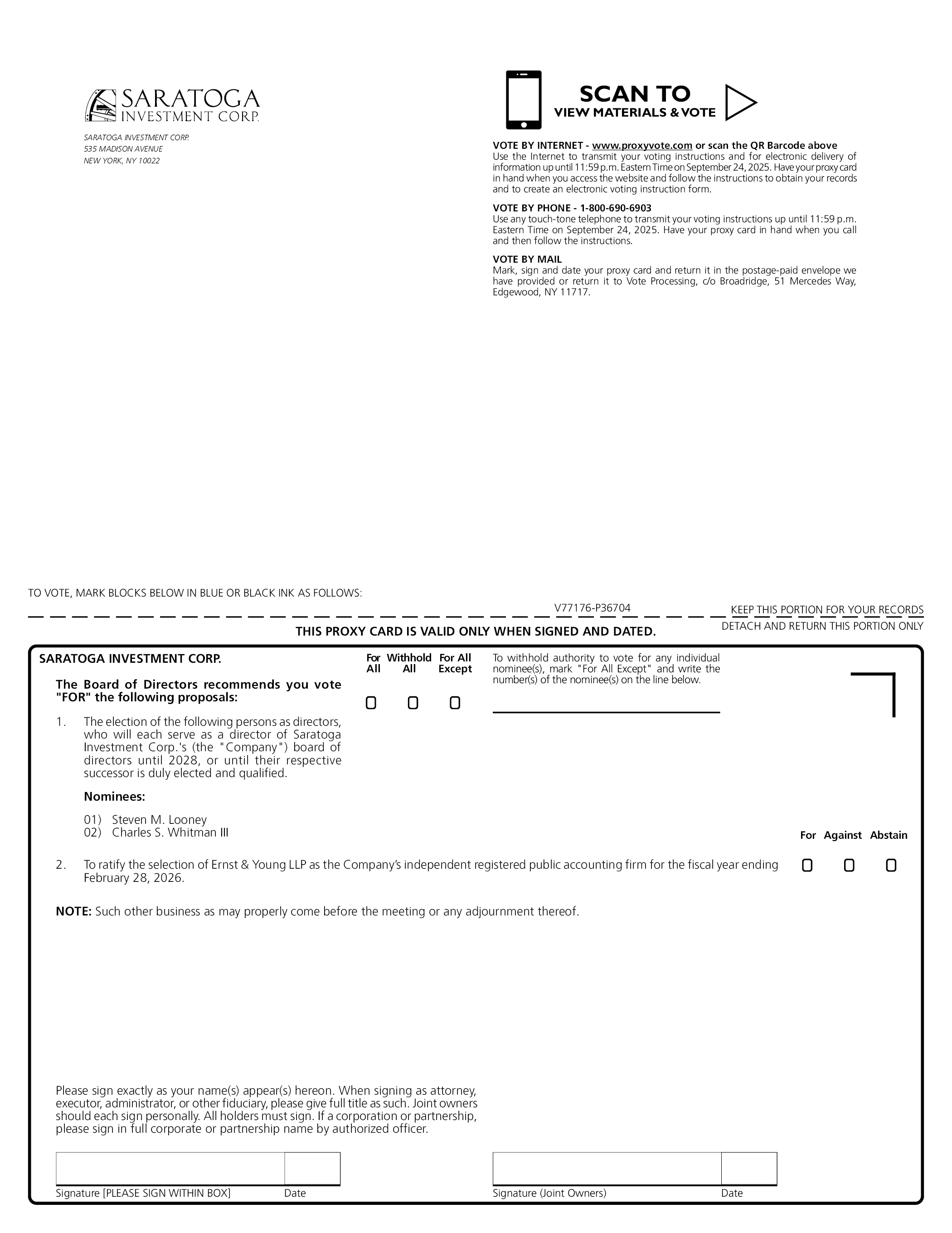 SARATOGA INVESTMENT CORP. 535 MADISON AVENUE NEW YORK, NY 10022 SCAN TO VIEW MATERIALS & VOTE VOTE BY INTERNET - www.proxyvote.com or scan the QR Barcode above Use the Internet to transmit your voting instructions and for electronic delivery of information up until 11:59 p.m. Eastern Time on September 24, 2025. Have your proxy card in hand when you access the website and follow the instructions to obtain your records and to create an electronic voting instruction form. VOTE BY PHONE - 1-800-690-6903 Use any touch-tone telephone to transmit your voting instructions up until 11:59 p.m. Eastern Time on September 24, 2025. Have your proxy card in hand when you call and then follow the instructions. VOTE BY MAIL Mark, sign and date your proxy card and return it in the postage-paid envelope we have provided or return it to Vote Processing, c/o Broadridge, 51 Mercedes Way, Edgewood, NY 11717. TO VOTE, MARK BLOCKS BELOW IN BLUE OR BLACK INK AS FOLLOWS: KEEP THIS PORTION FOR YOUR RECORDS THIS PROXY CARD IS VALID ONLY WHEN SIGNED AND DATED. DETACH AND RETURN THIS PORTION ONLY V77176-P36704 Signature [PLEASE SIGN WITHIN BOX] Date Signature (Joint Owners) Date For Against Abstain SARATOGA INVESTMENT CORP. The Board of Directors recommends you vote “FOR” the following proposals: 2. To ratify the selection of Ernst & Young LLP as the Company’s independent registered public accounting firm for the fiscal year ending February 28, 2026. To withhold authority to vote for any individual nominee(s), mark “For All Except” and write the number(s) of the nominee(s) on the line below. For All Withhold All For All Except 01) Steven M. Looney 02) Charles S. Whitman III 1. The election of the following persons as directors, who will each serve as a director of Saratoga Investment Corp.’s (the “Company”) board of directors until 2028, or until their respective successor is duly elected and qualified. Nominees: NOTE: Such other business as may properly come before the meeting or any adjournment thereof. Please sign exactly as your name(s) appear(s) hereon. When signing as attorney, executor, administrator, or other fiduciary, please give full title as such. Joint owners should each sign personally. All holders must sign. If a corporation or partnership, please sign in full corporate or partnership name by authorized officer.