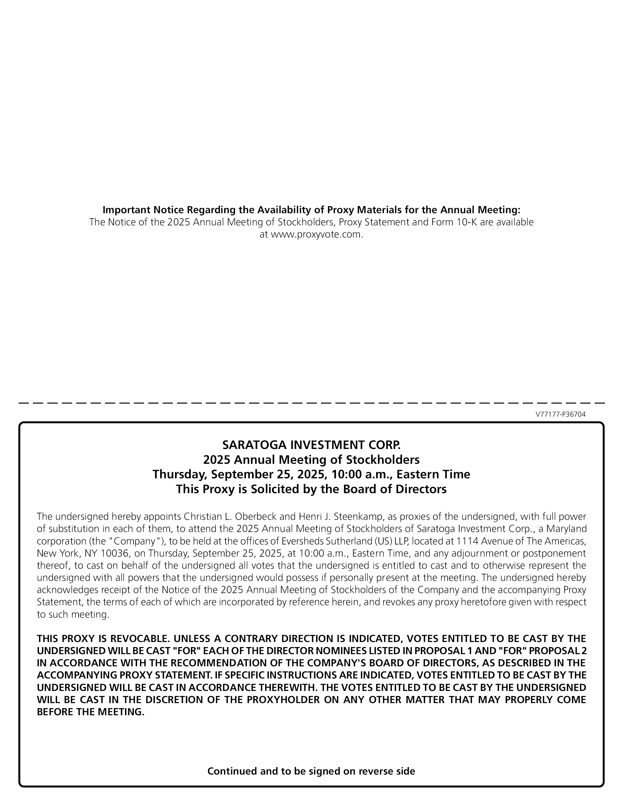 Important Notice Regarding the Availability of Proxy Materials for the Annual Meeting: The Notice of the 2025 Annual Meeting of Stockholders, Proxy Statement and Form 10-K are available at www.proxyvote.com. V77177-P36704 SARATOGA INVESTMENT CORP. 2025 Annual Meeting of Stockholders Thursday, September 25, 2025, 10:00 a.m., Eastern Time This Proxy is Solicited by the Board of Directors The undersigned hereby appoints Christian L. Oberbeck and Henri J. Steenkamp, as proxies of the undersigned, with full power of substitution in each of them, to attend the 2025 Annual Meeting of Stockholders of Saratoga Investment Corp., a Maryland corporation (the “Company”), to be held at the offices of Eversheds Sutherland (US) LLP, located at 1114 Avenue of The Americas, New York, NY 10036, on Thursday, September 25, 2025, at 10:00 a.m., Eastern Time, and any adjournment or postponement thereof, to cast on behalf of the undersigned all votes that the undersigned is entitled to cast and to otherwise represent the undersigned with all powers that the undersigned would possess if personally present at the meeting. The undersigned hereby acknowledges receipt of the Notice of the 2025 Annual Meeting of Stockholders of the Company and the accompanying Proxy Statement, the terms of each of which are incorporated by reference herein, and revokes any proxy heretofore given with respect to such meeting. THIS PROXY IS REVOCABLE. UNLESS A CONTRARY DIRECTION IS INDICATED, VOTES ENTITLED TO BE CAST BY THE UNDERSIGNED WILL BE CAST “FOR” EACH OF THE DIRECTOR NOMINEES LISTED IN PROPOSAL 1 AND “FOR” PROPOSAL 2 IN ACCORDANCE WITH THE RECOMMENDATION OF THE COMPANY’S BOARD OF DIRECTORS, AS DESCRIBED IN THE ACCOMPANYING PROXY STATEMENT. IF SPECIFIC INSTRUCTIONS ARE INDICATED, VOTES ENTITLED TO BE CAST BY THE UNDERSIGNED WILL BE CAST IN ACCORDANCE THEREWITH. THE VOTES ENTITLED TO BE CAST BY THE UNDERSIGNED WILL BE CAST IN THE DISCRETION OF THE PROXYHOLDER ON ANY OTHER MATTER THAT MAY PROPERLY COME BEFORE THE MEETING. Continued and to be signed on reverse side